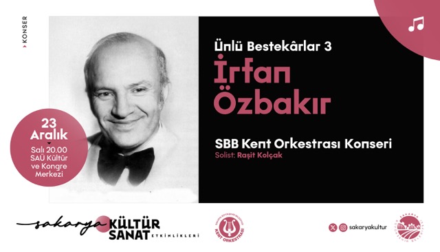 Aynı günün akşamında ise SBB Kent Orkestrası, ‘Ünlü Bestekârlar – İrfan Özbakır’ temalı konserle müzikseverlere keyifli anlar yaşatacak. Konser, saat 20.00’de SAÜ Kültür ve Kongre Merkezi’nde gerçekleştirilecek ve orkestraya solist Raşit Kolçak eşlik edecek.